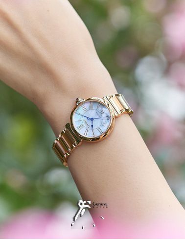 ساعت مچی زنانه با قاب و دستبند طلایی رنگ و دارای شیشه سافایرکریستال(ضد خش) سیتیزن