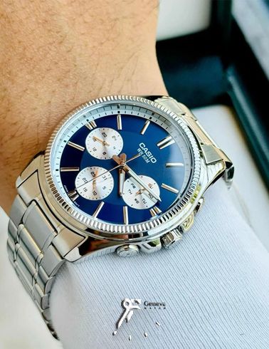 ساعت مچی کلاسیک مردانه با بند استیل و ضقحه گرد سرمه ای رنگ با قابلیت نمایش روزهای هفته کاسیو