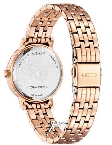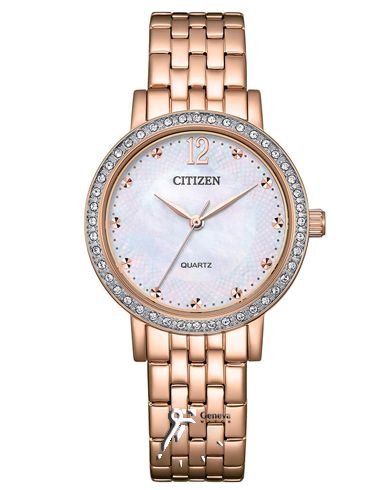 ساعت مچی زنانه کلاسیک با بند استیل رزگلد، قاب نگین دار و صفحه نگین دار صدفی سیتیزن
