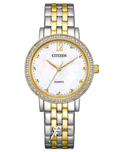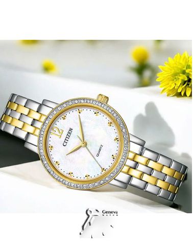 ساعت مچی زنانه کلاسیک نگین دار با بند استیل دو رنگ و صفحه صدفی، موتور کوارتز سیتیزن