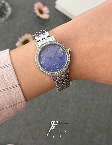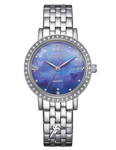 ساعت مچی زنانه کلاسیک نگین دار با بند استیل ضد حساسیت و صفحه آبی رنگ با طرح پروانه و مقاوم در برابر آب(50متر) سیتیزن