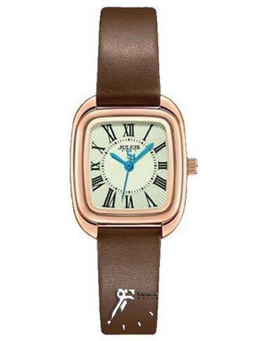 ساعت مچی عقربه ای زنانه با بند چرم قهوه ای و قاب رزگلد و دارای صفحه ای با شماره های رومی جولیوس