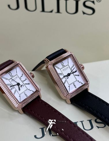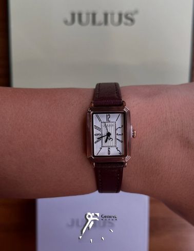 ساعت مچی اورجینال زنانه با بند چرم قهوه ای، صفحه مستطیل شکل و موتور کوارتز جولیوس