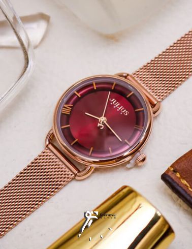 ساعت مچی کلاسیک زنانه با بند حصیری رزگلد و صفحه قرمز رنگ و شیشه مینرال جولیوس