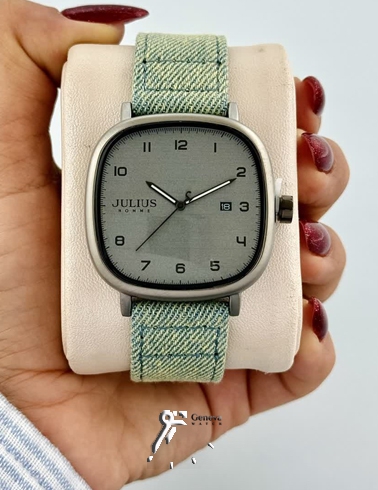 ساعت مچی مردانه با بند چرم روکش پارچه ای دارای عقربه های شب نما جولیوس