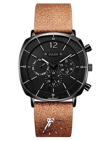 ساعت مچی کلاسیک مردانه با بند چرم قهوه ای دارای شب نما، نمایش روزهای هفته و مقاوم در برابر آب (50 متر) جولیوس