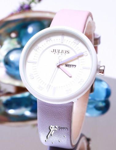 ساعت مچی عقربه ای زنانه و دخترانه جولیوس با بند چرمی صورتی و یاسی رنگ دارای تقویم و نمایش روزهای هفته