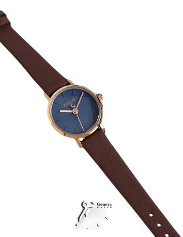 ساعت مچی زنانه با بند چرم قهوه ای رنگ و صفحه سرمه ای دارای 2 سال گارانتی شرکت جولیوس